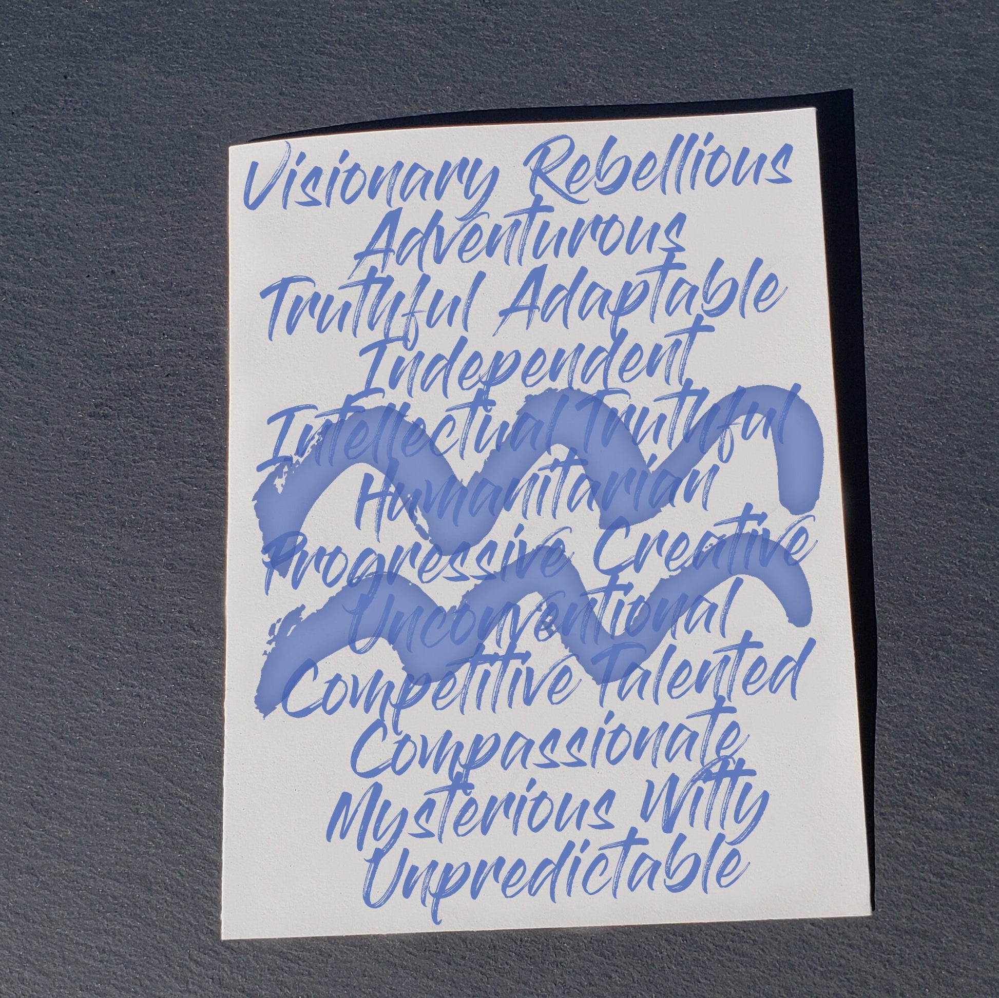 The front of the card features some of our favourite traits of this classic air sign, and the zodiac symbol hand painted across the text in a shimmer metallic watercolor.